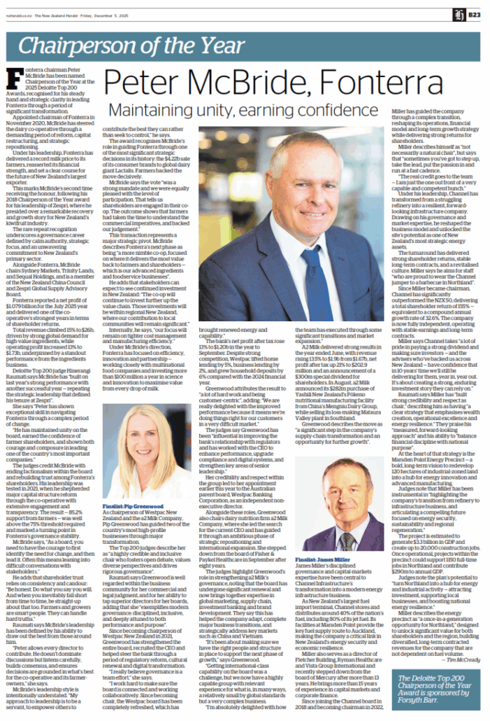 Deloitte Top 200: Fonterra’s Peter McBride wins 2025 chair of the year award