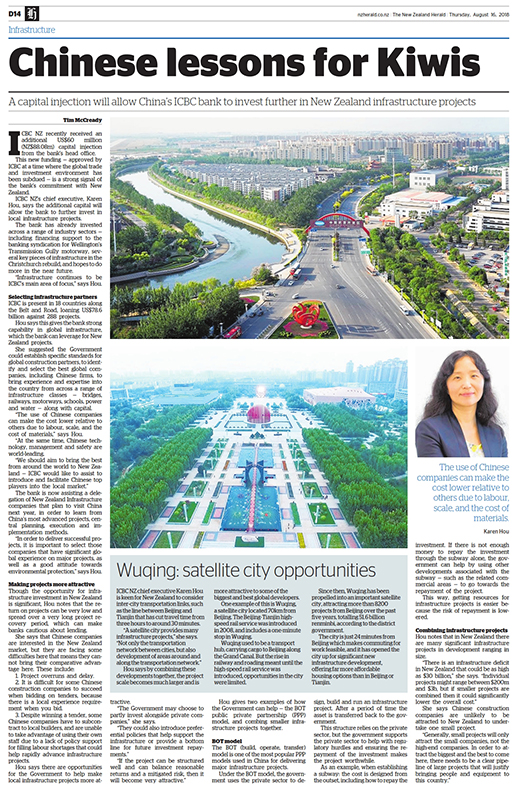 The bank is now assisting a delegation of New Zealand Infrastructure companies that plan to visit China next year, in order to learn from China’s most advanced projects, central planning, execution and implementation methods.